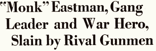 - "'Monk' Eastman, gang leader and war hero, slain by rival gunmen," New York Tribune, Dec. 27, 1920, p. 1.